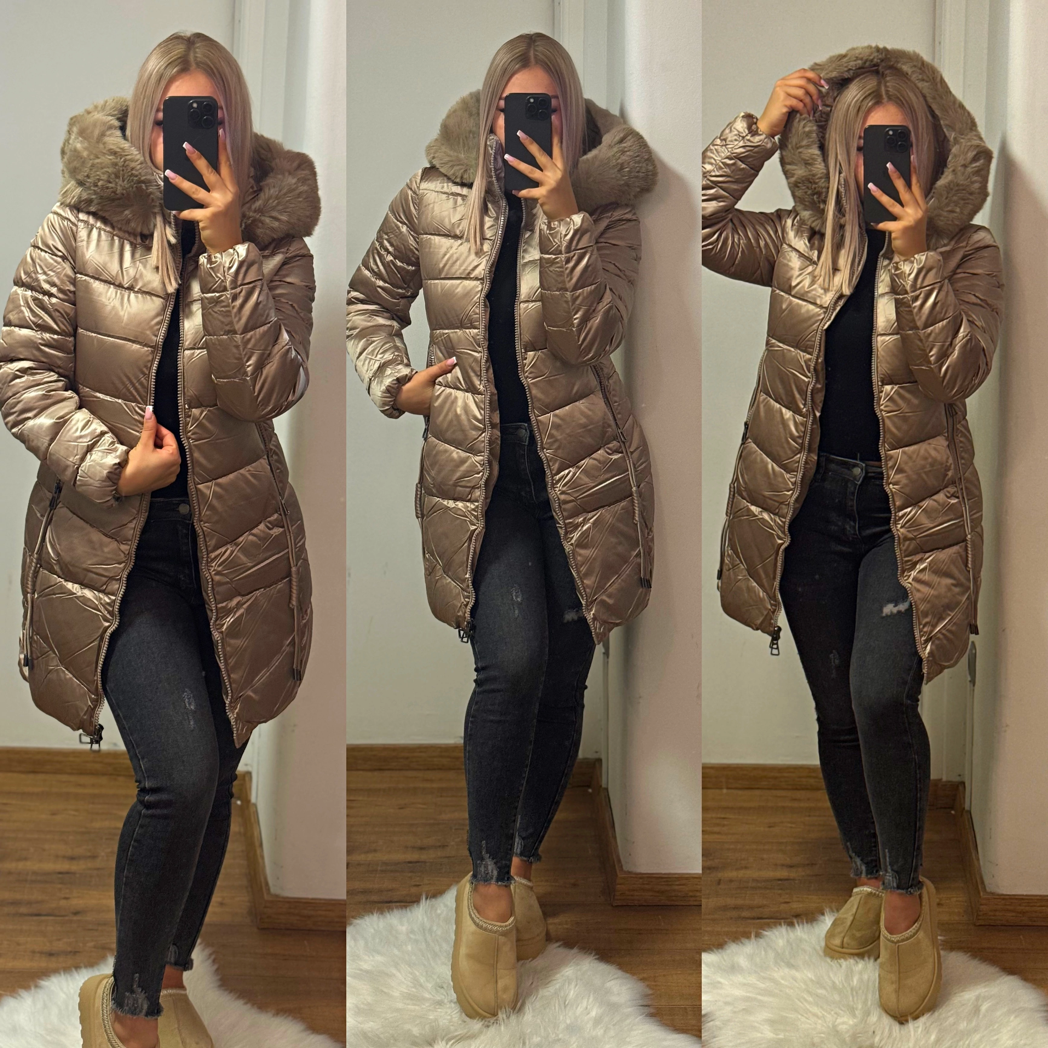 Stílusos, mégis praktikus választás a hideg napokra! Az Aurora arany fényű középhosszú kabát melegen tart és ragyogó megjelenést biztosít. Fényes, enyhén metálos arany árnyalata elegáns, nőies megjelenést kölcsönöz, miközben a steppelt fazon és a nagy, puha szőrmeszegélyes kapucni gondoskodik a maximális kényelemről. Cipzáras záródás, oldalzsebek, és karcsúsított szabás teszi tökéletessé a mindennapi viselethez.