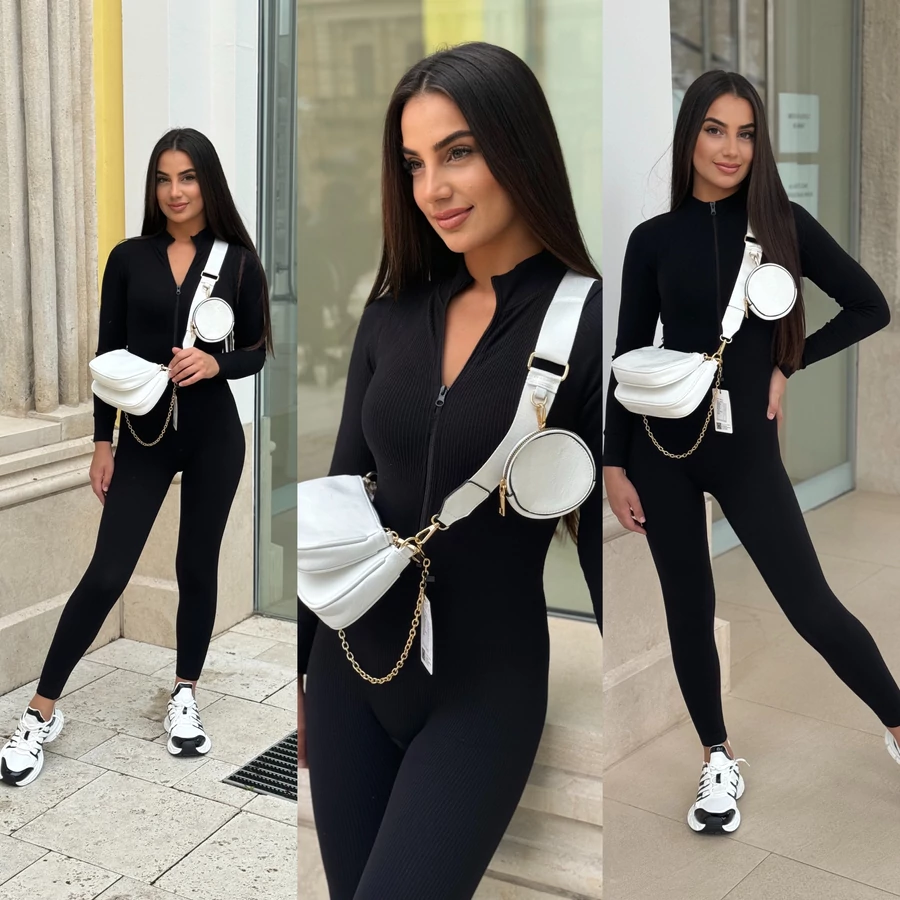 Légy magabiztos és stílusos a Bella overálban! XS-től M méretig ajánlott, egyméretes kialakításának köszönhetően tökéletesen illeszkedik. Középen cipzáros, alakformáló hatású, rugalmas bordázott anyagból készült, ami kiemeli a nőies vonalakat, miközben kényelmes viselet egész nap. Sportcipővel és magassarkúval is tökéletes választás.