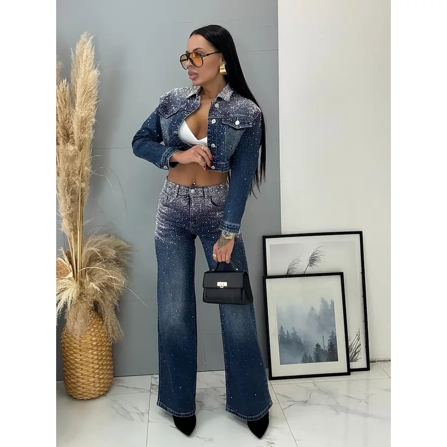 Női elegáns együttes a legújabb kollekcióból. Gombos kabátkából és magas derekú nadrágból áll. Anyaga kellemes, elasztikus. A gombok ezüst színűek. Strasszkövekkel díszített.