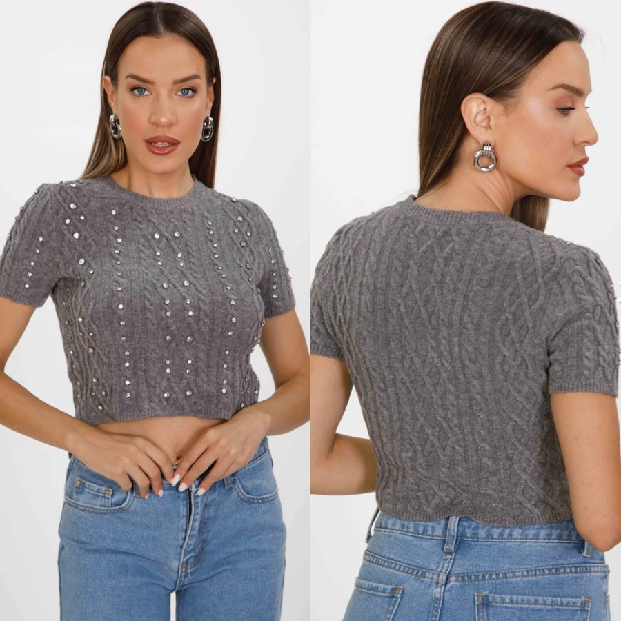 Stílusos szürke rövid pulóver apró kövekkel díszítve. Kötött anyaga kényelmes, enyhén rugalmas, így csinosan simul a testre. Egyméretes, XS–M méretig ajánlott.
